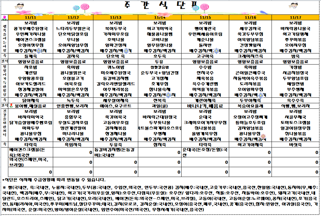| 제목 | [영양서비스] 2024년 11월 2주차 식단표 | ||