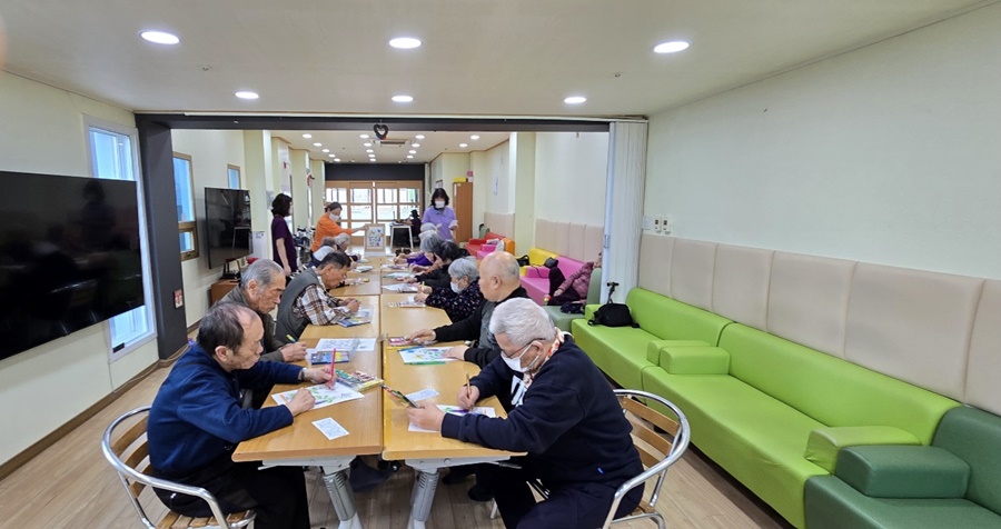 우리 어르신들께서 강사님의 친절한 설명과 함께 원본도안을 보면서 나비 문양의 도얀에 색색가지의 색상을 칠하고 계십니다